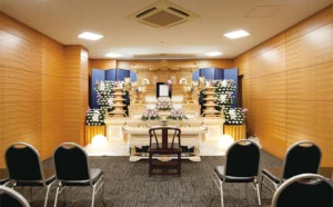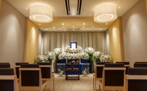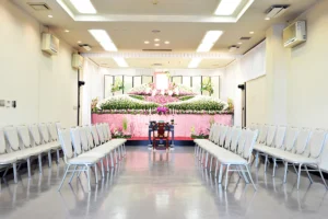 谷塚斎場「桜の間」は、少人数での家族葬に適した式場で、30席程度の椅子席をご用意しています。他の小規模式場と比較して中程度の費用感で、規模と価格のバランスが取れています。火葬場が併設されているため、式場からの移動負担がなく、ご遺族様の時間や体力の消耗を抑えられます。30名までの規模で宿泊は不可となりますが、この条件をクリアできれば家族葬や一日葬に最も適した式場です。故人様と静かに最期のお別れをするのに最適な空間です。