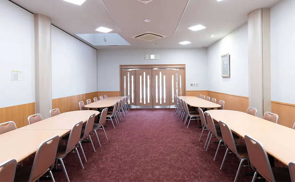 戸田葬祭場の「せせらぎの間」は、本館4階に設けられた、なじみやすい広さと穏やかな空気が流れる式場です。最大70席の椅子席をご用意でき、ごく一般的な規模のお通夜やご葬儀に最適です。式場が2つ用意されており、様々なニーズに対応可能です。式場内は程よい広さの空間で、在りし日の故人様を偲び、しめやかに旅立ちをお見送りいただけます。親族控室にはシャワー室も完備されているため、ご遺族様が心身ともに安らげるよう配慮された、使い勝手の良い式場です。